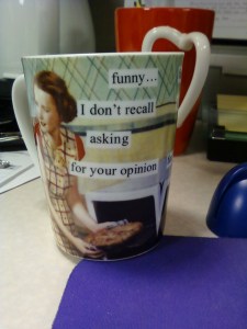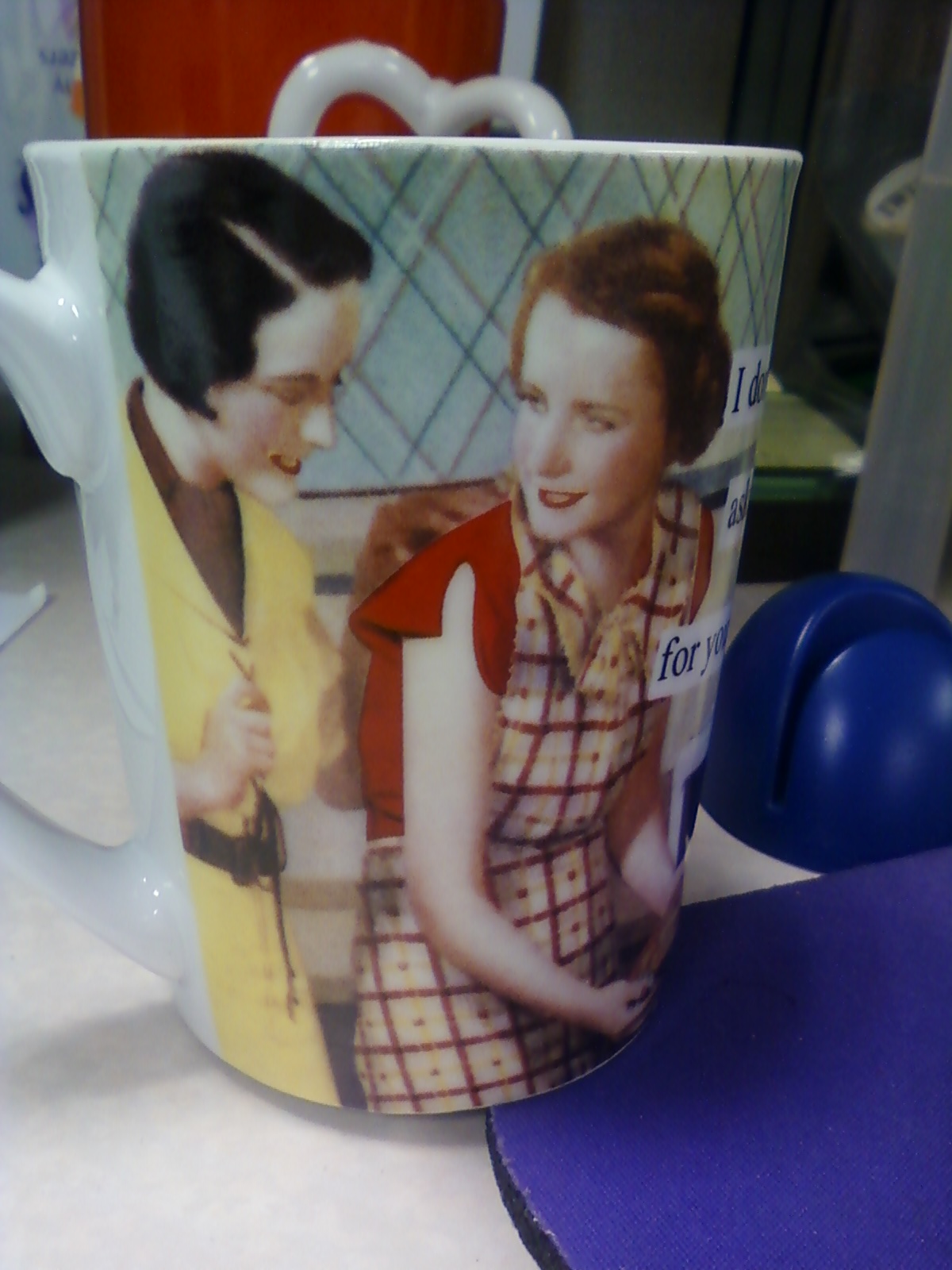 This is the cup I use at work, notice the two nice ladies. If you turn the cup you see what they are saying. Now, some people who know me will say that is not something I would say, however, my BFF (Em) would say that is exactly me!