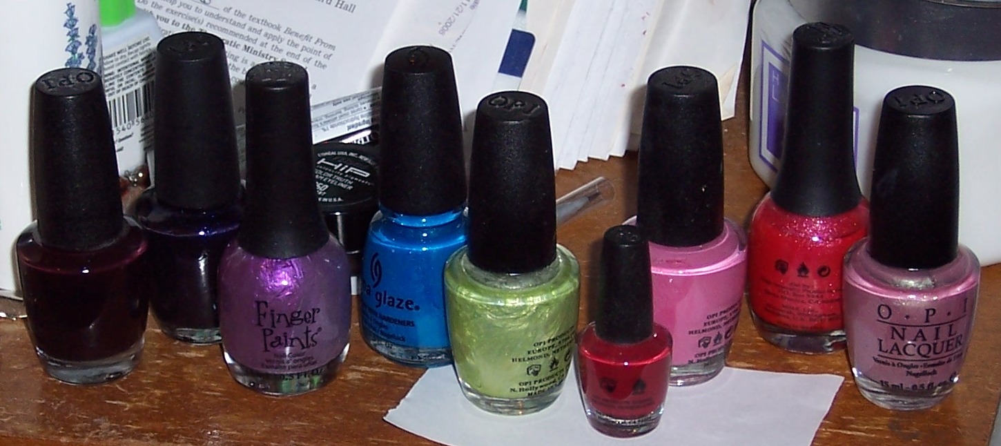 So I lined up my bottles of polish to try to decide.Should I go dark, it’s not spring yet, but it is going to be spring next week, so what color, the lavender or blue or maybe that grass green polish? Or should I be traditional, rose or red or mauve, this is so difficult!