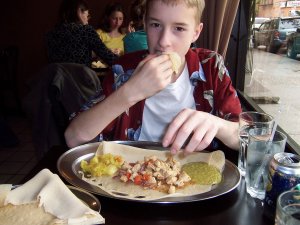 When done with my manicure I went to Starbucks for tea and I learned that I shouldn’t carry a paper cup of hot tea while checking my e-mail (ouchie!) Then I texted Em and she said to meet her at Madison Square Park(MSP). In case you don’t know, MSP is next to the Flat Iron Building and in MSP is the ‘Shake Shack‘ where Em was in line to get Fred a malted and agreed to get me a hamburger. Em had taken my camera because the Ethiopian restaurant they were going to was recommended to them by one of Fred’s teachers so she wanted to take a picture of him there and that morning she couldn’t find her camera.
