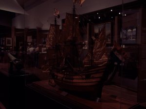The museum is at 1220 Fifth Avenue which is between 103rd St and 104th St. It is in a part of 5th Ave called Museum Mile. There is where the Solomon R. Guggenheim Museum is (at 89th Street) and The Jewish Museum (at 92nd Street), neither museum is high on my list of museums to see. We had lunch at a place called Paola’s on Madison. Then we went to the museum. Camera’s were allowed, but not flashes. My camera has a museum setting but some of the exhibits were dark and didn’t turn out well. This is a model of the Half Moon, and cases were glass with black shelves, so if the item being displayed was dark, you can’t really see it in the picture. Some displays however,