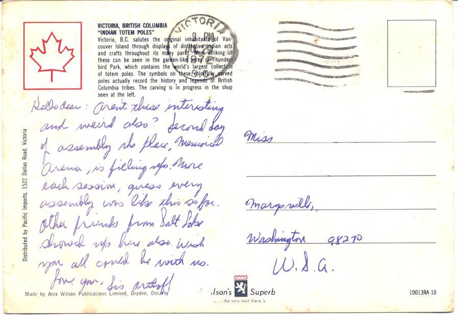 This was sent to me by a lady in my church. She had gone to Canada to attend a religious convention. I don’t remember her going, I do remember her. You can see the year was 1972, and I was living in Washington State at the time.