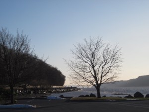 We ended up at the second place, sitting in the bar, waiting for the train. I had a sort of martini with Pomegranate liqueur and vodka, kind of so-so. Gary had bourban. Then I had a Sombrero with a splash of Baileys added. It was very good. I will have to remember that. I took this picture from the parking lot, can’t you see how cold it was? Does anyone else think the river looks angry? I think in wintertime the river gets an angry look. Maybe I had too much to drink. Nah …..