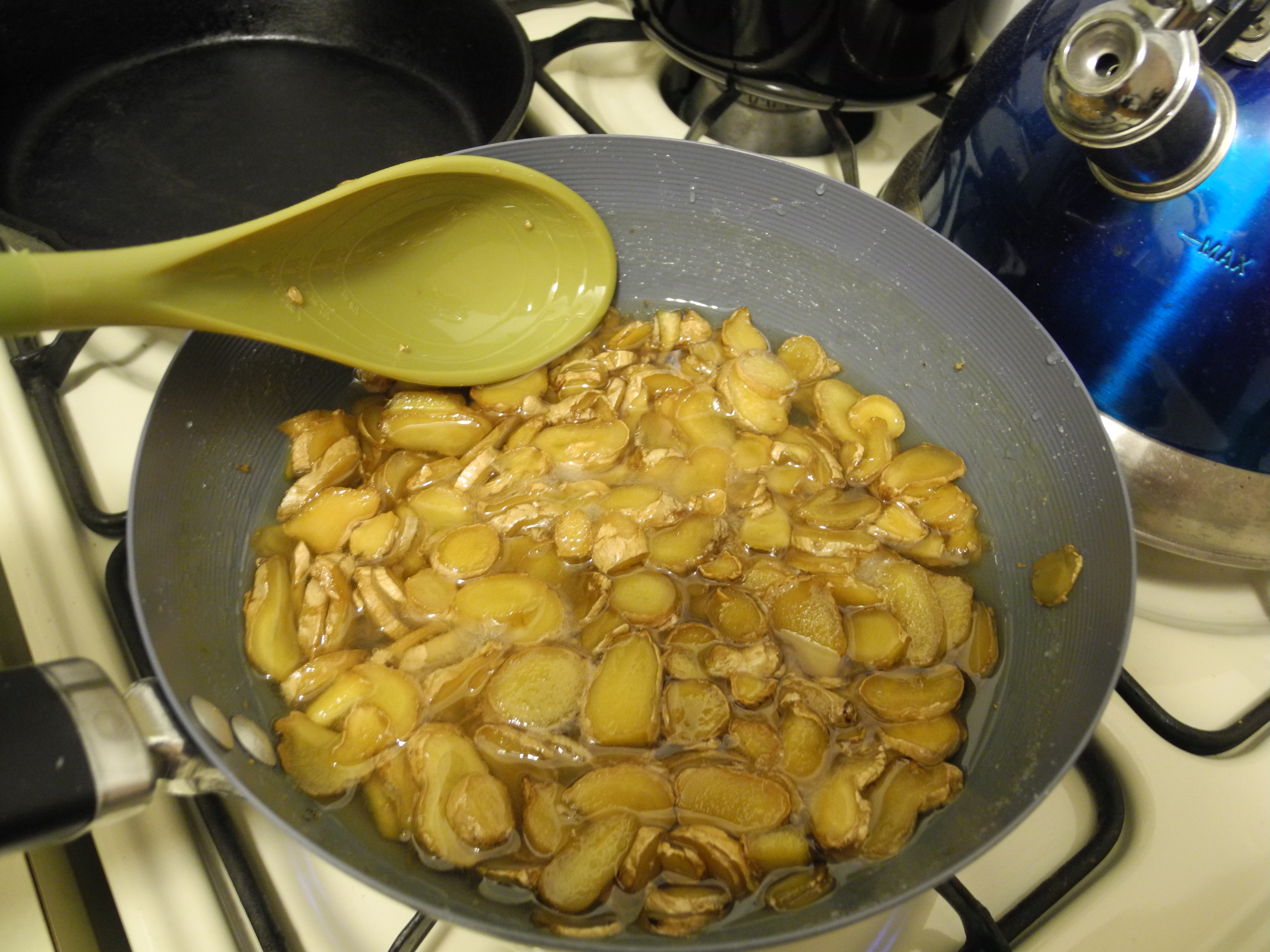 DSCN0477Tonight I decided to make candied ginger. I started eating it for my stomach and got addicted to it. It’s another thing where reading the ingredients is tiring. Unlike the hummus and lentils, I have never made candied ginger before. So I googled it, then went to the store. Now, there was nothing in the instructions saying how to pick out good ginger, not thinking it made a difference I just kept filling the bag until I had a pound, bought some sugar and milk (I was out of milk) and headed home. Besides not knowing how to pick out good ginger, I had completely forgotten the directions said to ‘peel and slice ginger’. I don’t have a peeler, so the ginger was washed and sliced and I made candied ginger with the peel on. It took forever to slice the ginger, Alton Brown says to use a MANDOLINE, so I think I will get one. After cooking the ginger ‘gently’, which I had no idea how to cook something gently, till it was tender, there again “HUH? Tender, yeah no idea.” the directions say to weigh the cooked ginger and add an equal amount of sugar, then add 3 tablespoons of water and bring to a boil. I checked two recipes and both had the same amount of liquid, I was skeptical but followed the directions. You can see by the picture, there is a lot of liquid there. Where did it all come from? Can you see now why I don’t cook? The directions also say to cook until the ginger gets dry, about 15-20 minutes. It took much longer and I started to panic, thinking maybe I had ruined it. For pity’s sake, I can ruin boiled eggs.