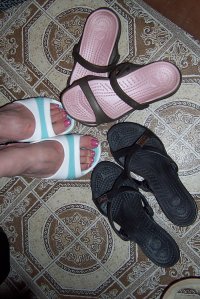 And I cut out early, head was starting to hurt, actually, it was hurting most of the day, I couldn’t get it to stop, so now I am home and my head no longer hurts. Hmmm. So M is at Pam’s and Stitch and Gwen are home with me. I was thinking about going to Target to look at that purse again, but I think I will look on-line. Maybe find a bargain on E-Bay or Amazon. I took a picture of my Crocs to post on the Yahoo group site.