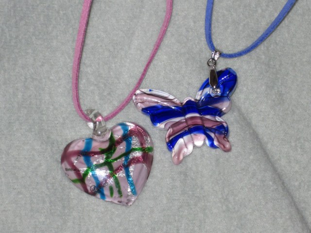 These are glass pendants, they are very popular at the street fairs. You can usually find a table in every block. They are also really cheap, most are $3 with $1 for the cord to hang them on. They are sold separately so you can match whatever color in the pendant you want with a cord. I have 3 that I got from street fairs and one that I got from a street vendor.